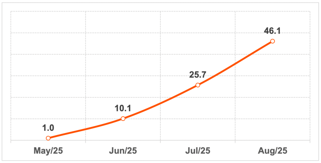 O TikTok Shop foi lançado no Brasil em maio de 2025, com o chamado “social commerce”, modelo de vendas em que toda a jornada de compra ocorre dentro da própria rede social. Naquele mês, o volume bruto de mercadorias somou US$ 1 milhão; em junho, saltou para US$ 10,1 milhões; em julho, para US$ 25,7 milhões; e, em agosto, atingiu US$ 46,1 milhões, segundo dados da Tabcut.